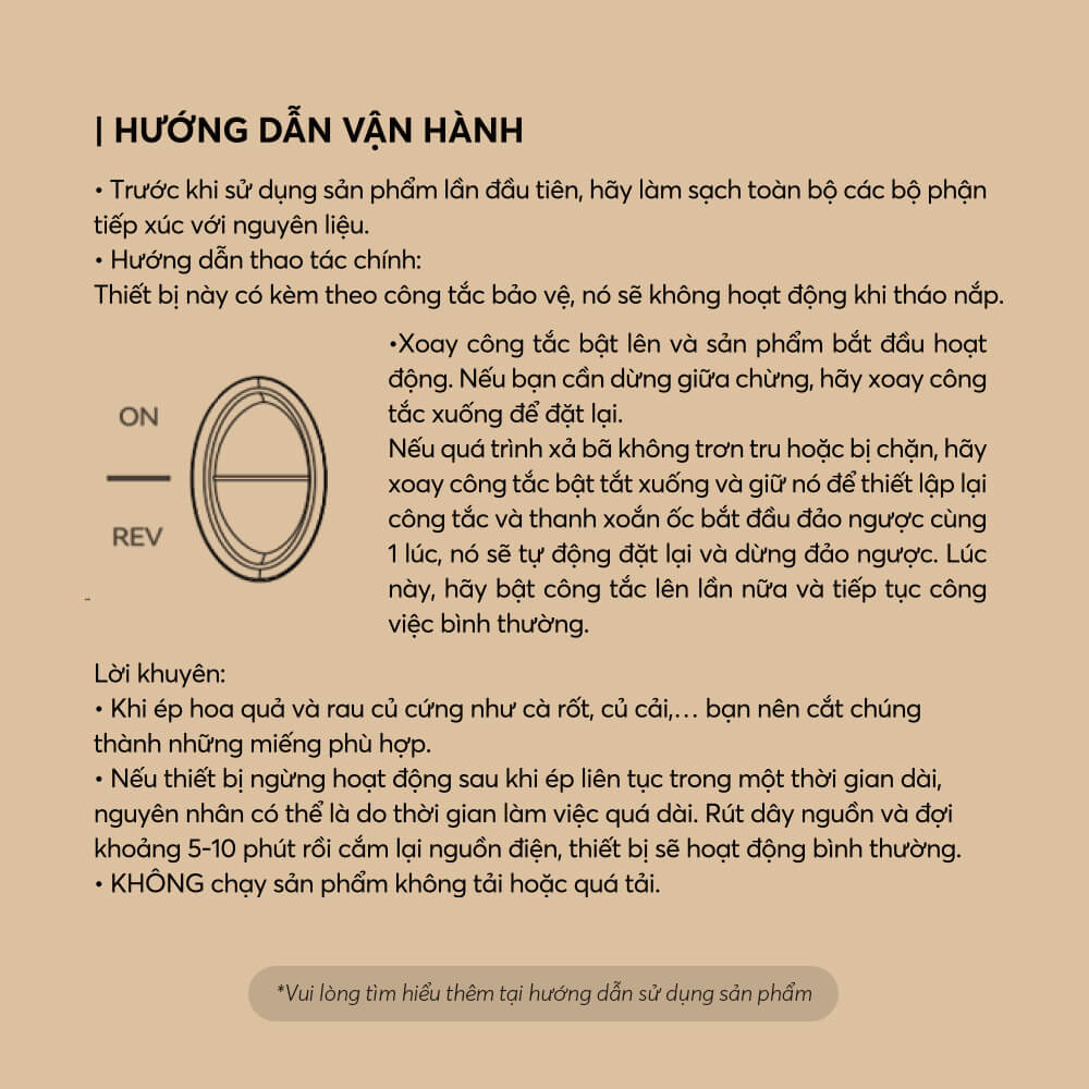 | Tốc độ ép | 50 – 60 vòng/phút (ép chậm, giữ dinh dưỡng) |