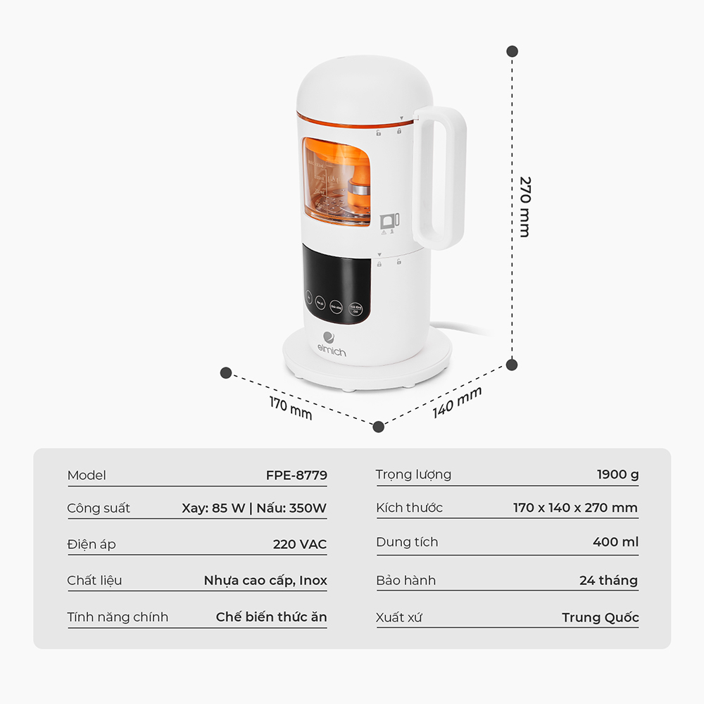 Máy hấp và xay thức ăn Elmich FPE-8779 là thiết bị chế biến ăn dặm 2-trong-1 giúp mẹ chuẩn bị bữa ăn cho bé nhanh chóng, an toàn và đầy đủ dinh dưỡng.
